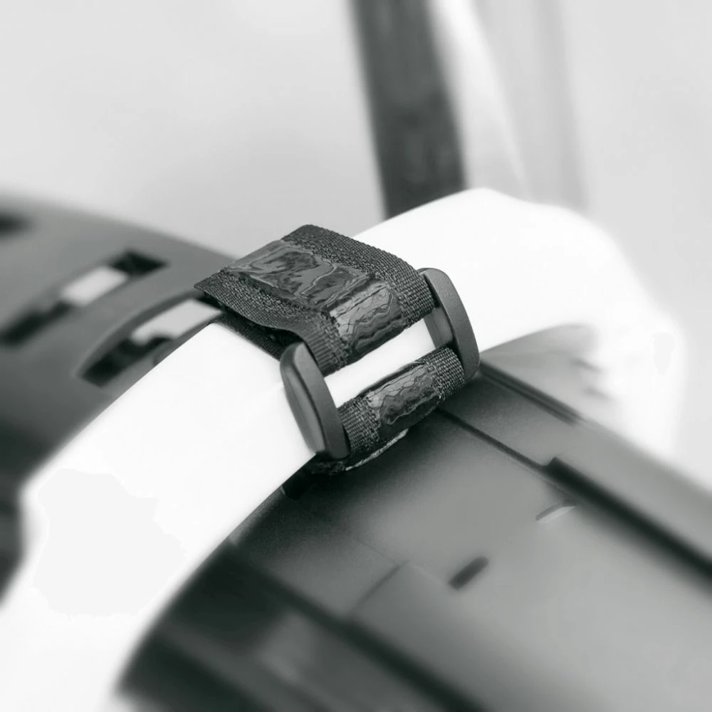 Vorne wird das VELOFLEXX an der Gabelbrücke mit einem gummierten Klettstrap oder Kabelbinder befestigt. Die Rahmenadapter machen die Montage an jeder Gabel möglich und sind zudem winkelverstellbar. Für noch mehr Halt sorgen die schwarz beschichteten Streben. Das VELOFLEXX-Set ist für Fitnessbikes, Mountainbikes und City Bikes geeignet. Klettstraps und Gummistraps sind im Lieferumfang enthalten.
