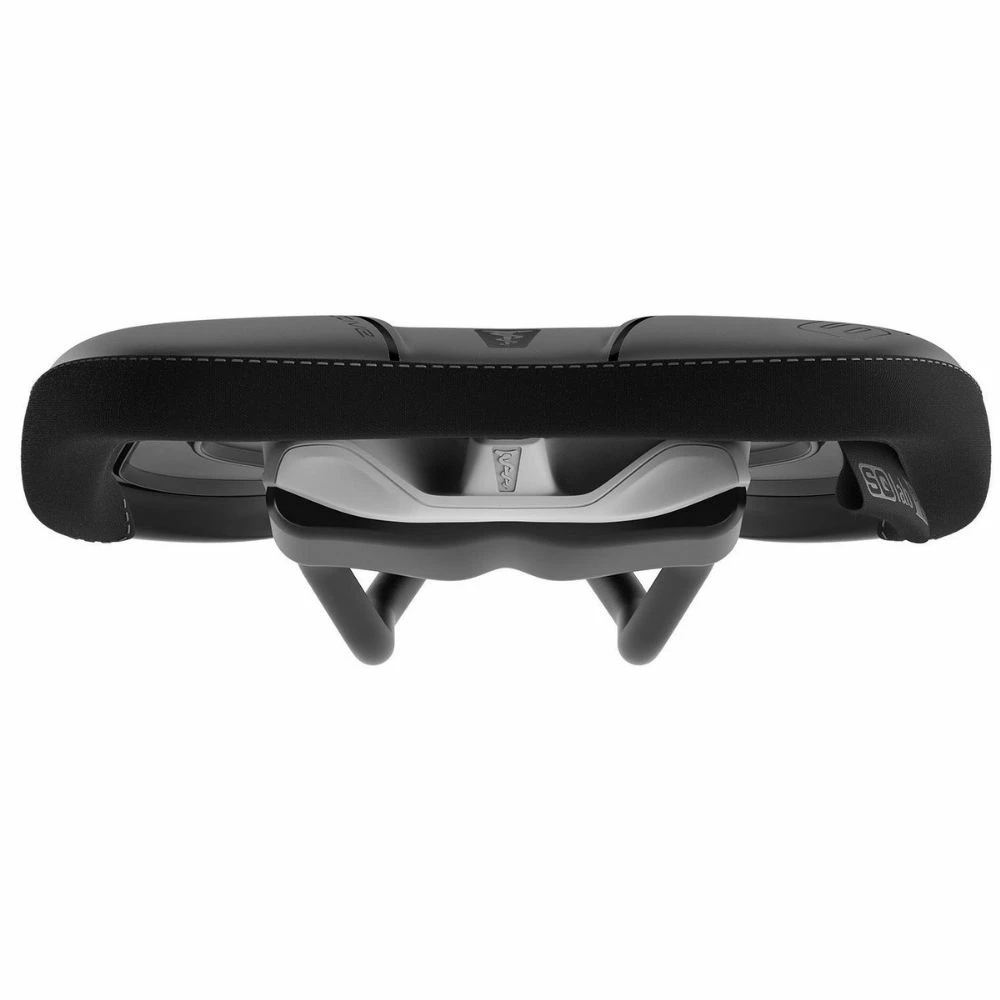 Der Sattel sorgt durch seine wellenartige Form und das hochgezogene Heck für den perfekten Halt nach hinten und eine optimale Druckverteilung bis in die tiefen Strukturen des Körpers wodurch die Kraftübertragung auf das Pedal wesentlich verbessert wird.